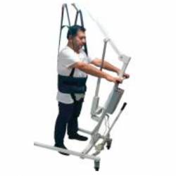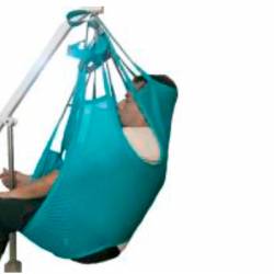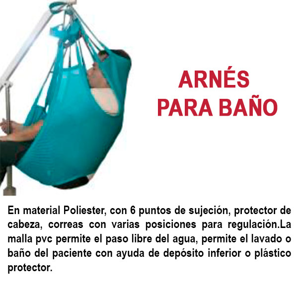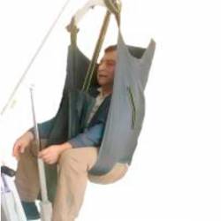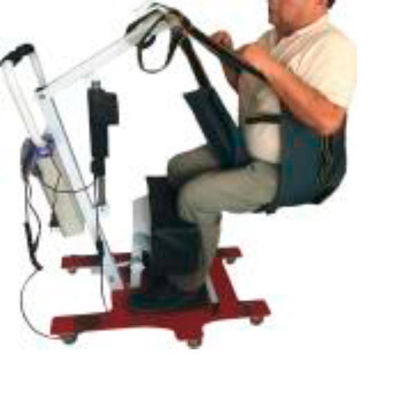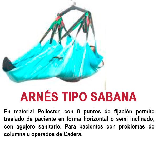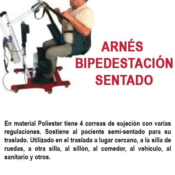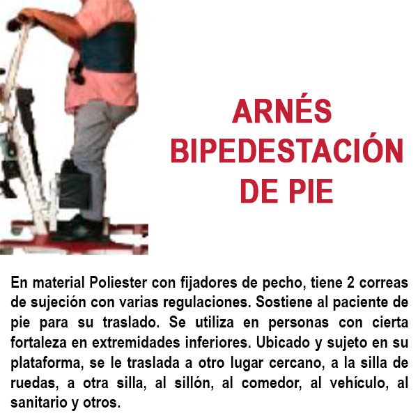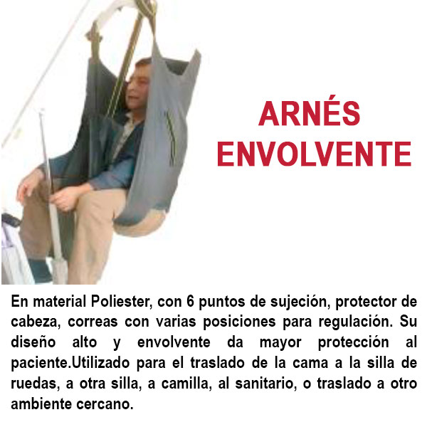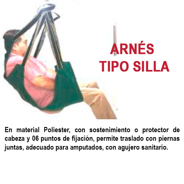 En material Poliester con fijadores de pecho, tiene 2 correas de sujeción con varias regulaciones. Sostiene al paciente de pie para su traslado. Se utiliza en personas con cierta fortaleza en extremidades inferiores. Ubicado y sujeto en su plataforma, se le traslada a otro lugar cercano, a la silla de ruedas, a otra silla, al sillón, al comedor, al vehículo, al sanitario y otros.