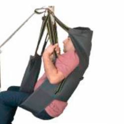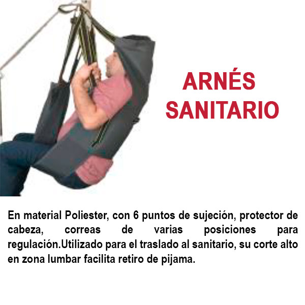 En material Poliester, con 6 puntos de sujeción, protector de cabeza, correas con varias posiciones para regulación. Su diseño alto y envolvente da mayor protección al paciente.Utilizado para el traslado de la cama a la silla de ruedas, a otra silla, a camilla, al sanitario, o traslado a otro ambiente cercano.